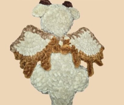 Rh 8 – Häkeln Sie die Oberseite des Flügels hoch, ca. 7 fM, nehmen Sie an der Spitze zu, häkeln Sie wieder nach unten, ca. 8 fM (~17).